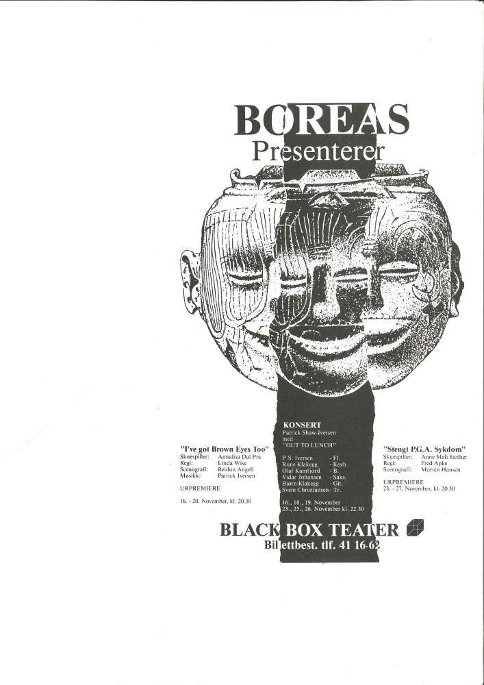 Forestillingsprogram fra Boreas Bulreadors produksjoner I've got brown eyes too (1988) og Stengt p.g.a. sykdom (1988)