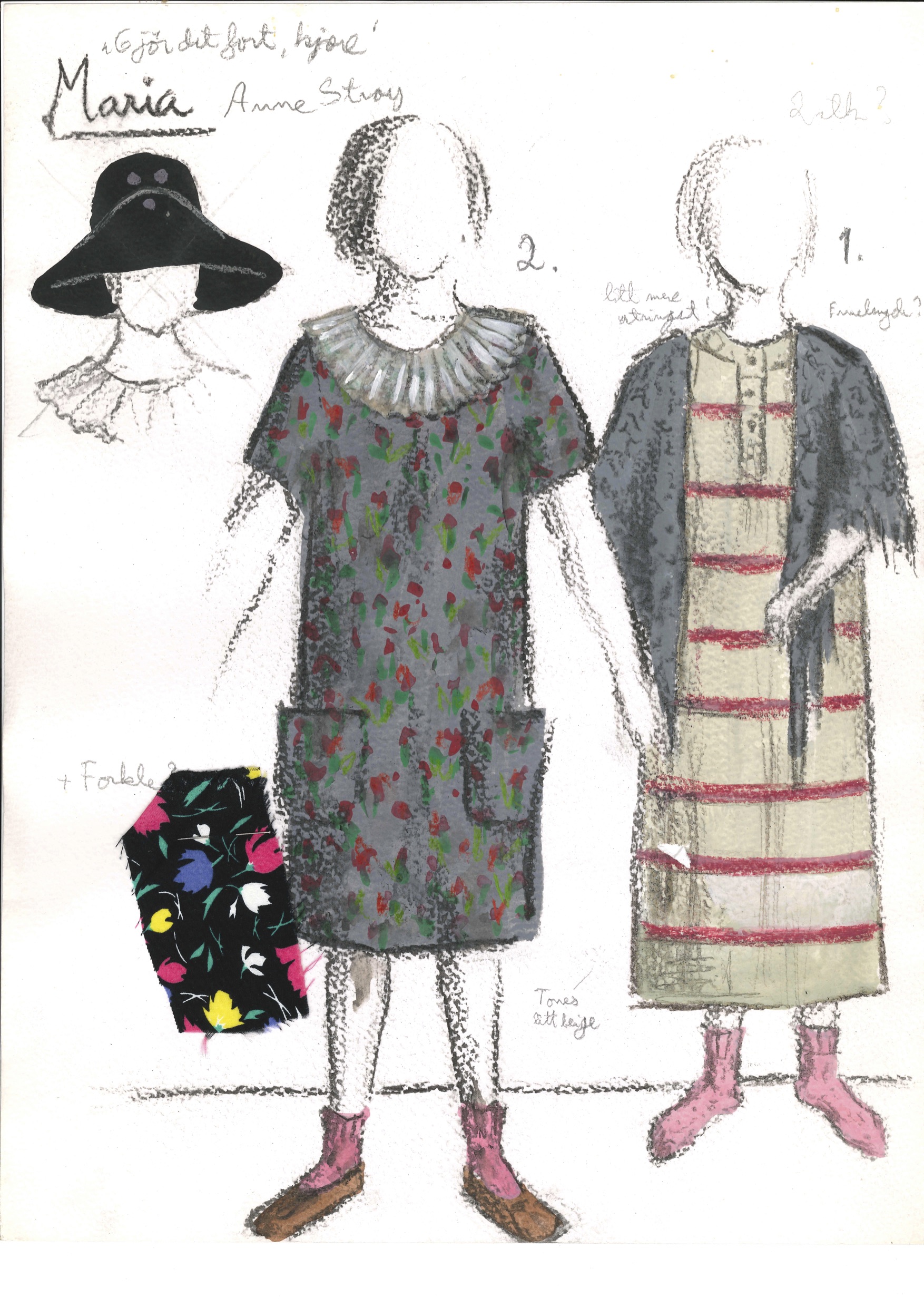 Kostymetegning av Einar Dahl fra Riksteatrets produksjon Gjør det fort, kjære! (1986)