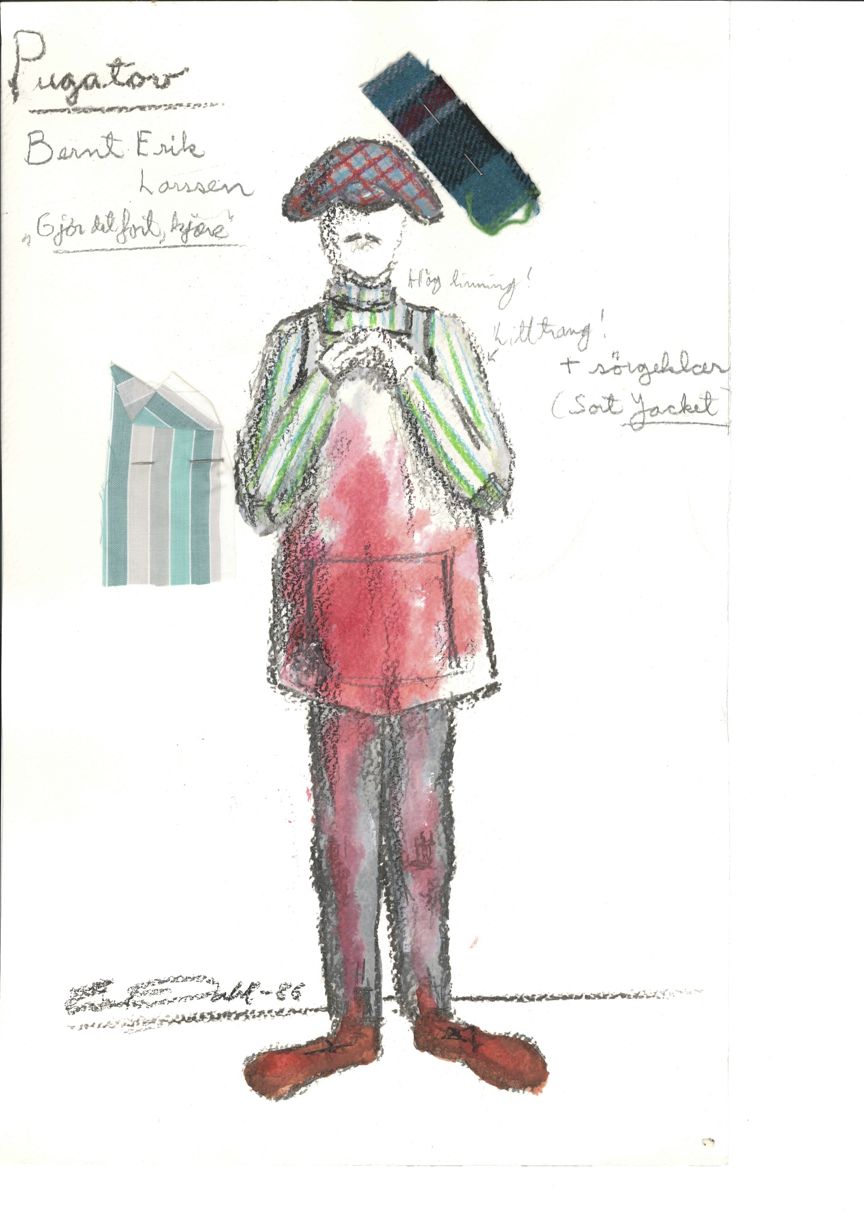 Kostymetegning av Einar Dahl fra Riksteatrets produksjon Gjør det fort, kjære! (1986)