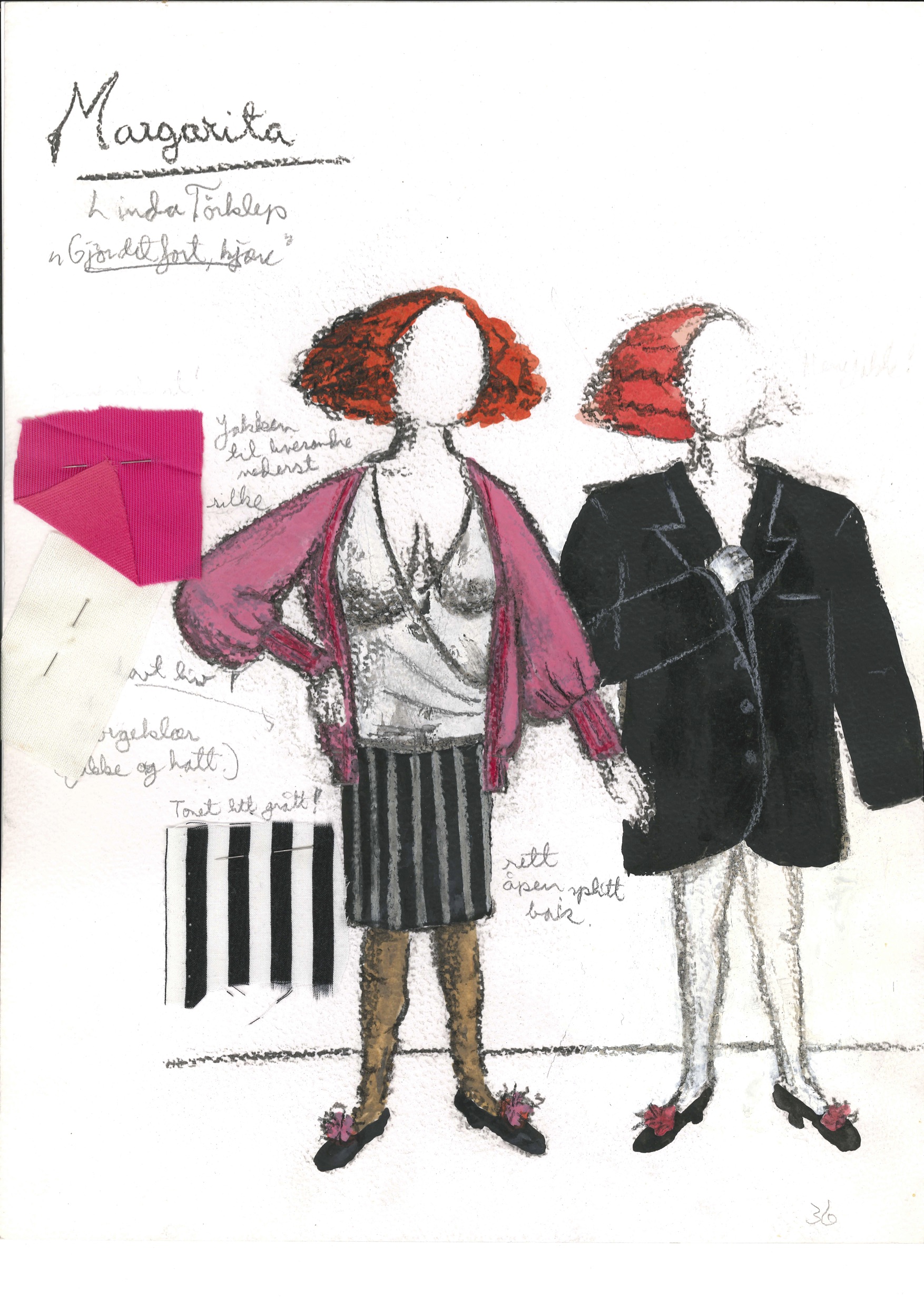 Kostymetegning av Einar Dahl fra Riksteatrets produksjon Gjør det fort, kjære! (1986)