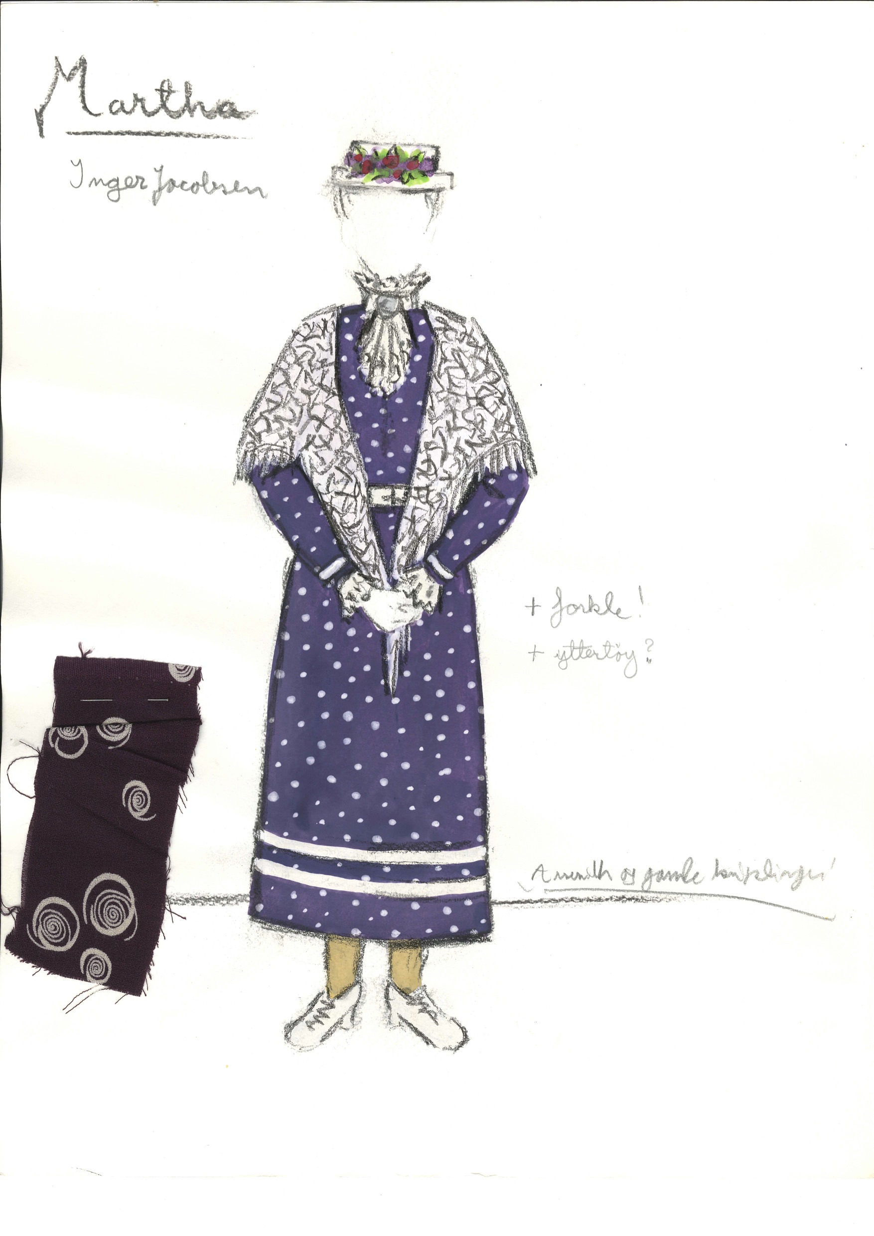 Kostymetegning av Einar Dahl fra Riksteatrets produksjon Arsenikk og gamle kniplinger (1985).
