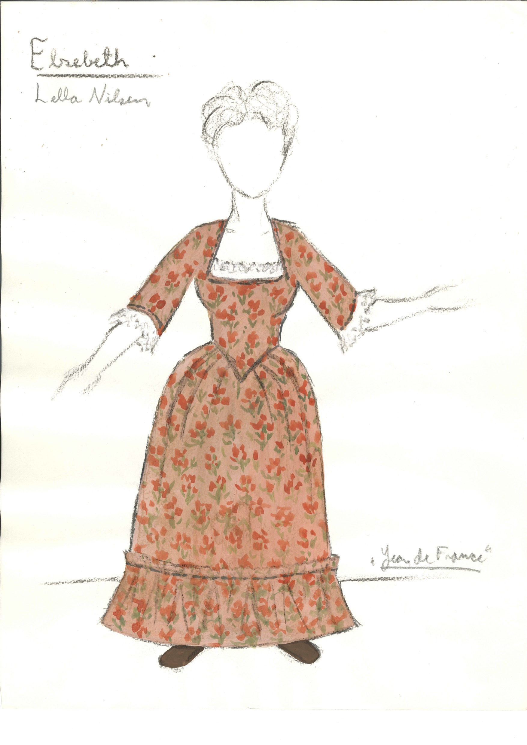 Kostymetegning av Einar Dahl fra Riksteatrets produksjon Jean de France (1985)