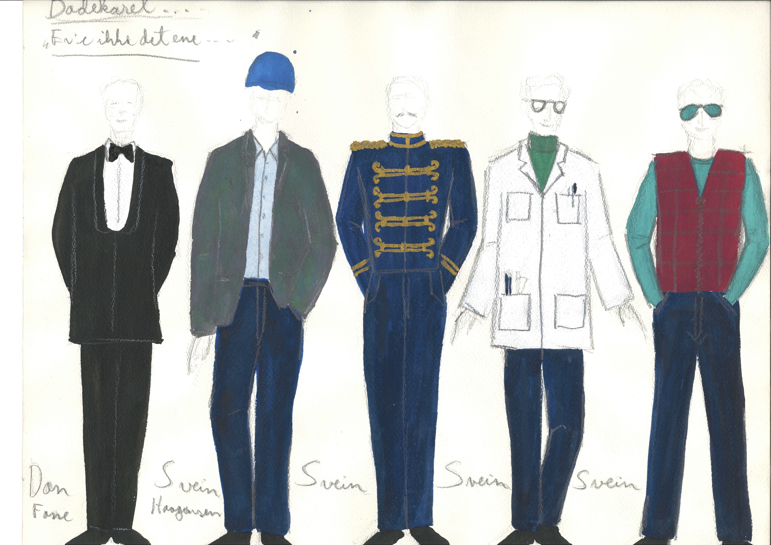 Kostymetegning av Einar Dahl fra Riksteatrets produksjon Er´e ikke det ene, så er´e det andre ... (1981).