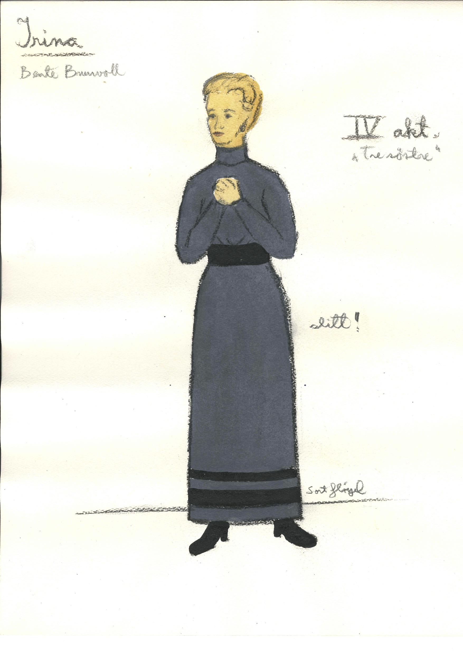 Kostymetegning av Einar Dahl fra Riksteatrets produksjon Tre søstre (1980)