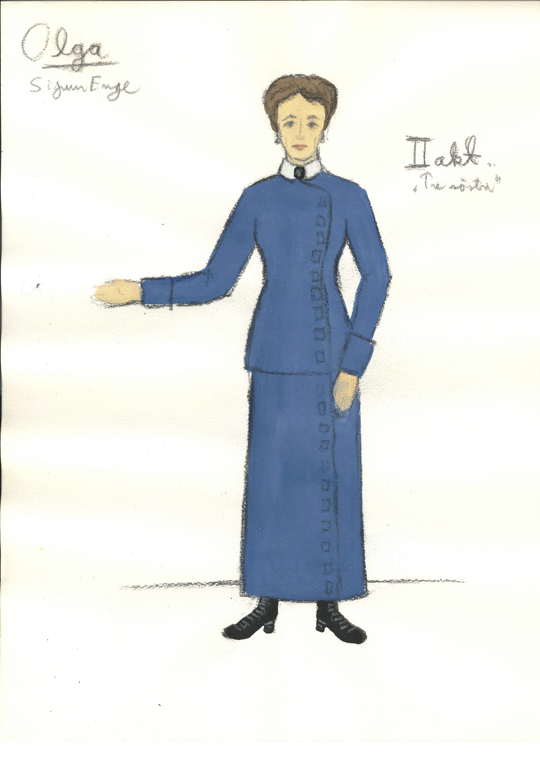 Kostymetegning av Einar Dahl fra Riksteatrets produksjon Tre søstre (1980)