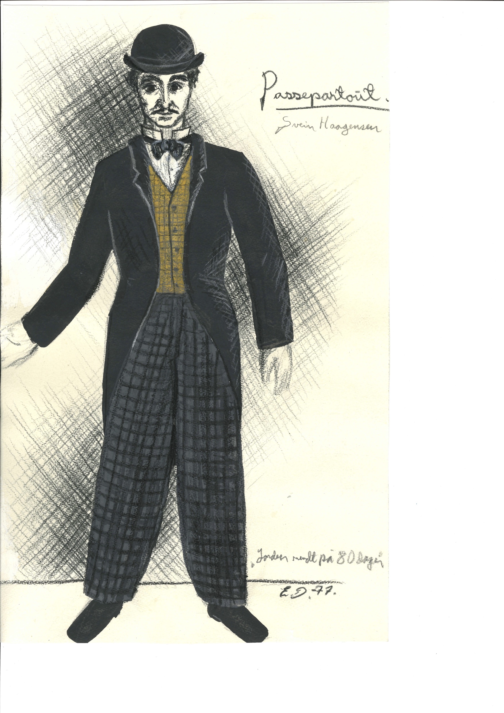 Kostymetegning av Einar Dahl fra Riksteatrets produksjon Jorden rundt på 80 dager (1978).