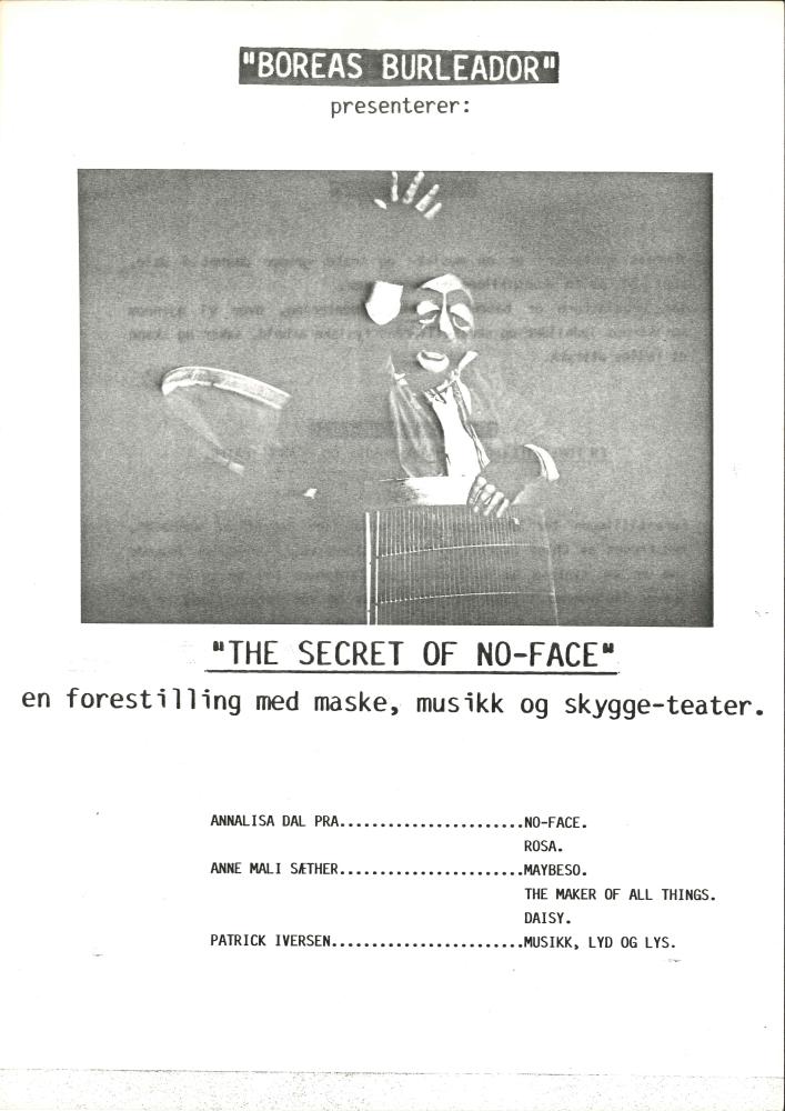 Program fra Boreas Teaters produksjon The Secret of No-Face (1985).