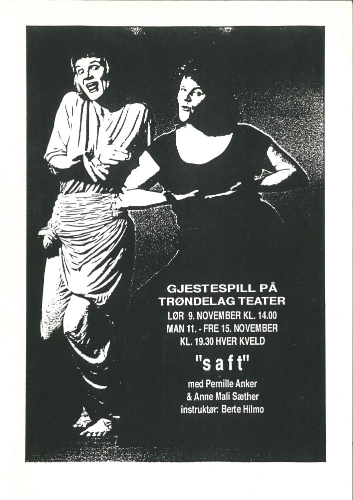 Forestillingsprogram fra Anne Mali Sæther, Pernille Anker og Berte Hilmos produksjon Saft (1990)