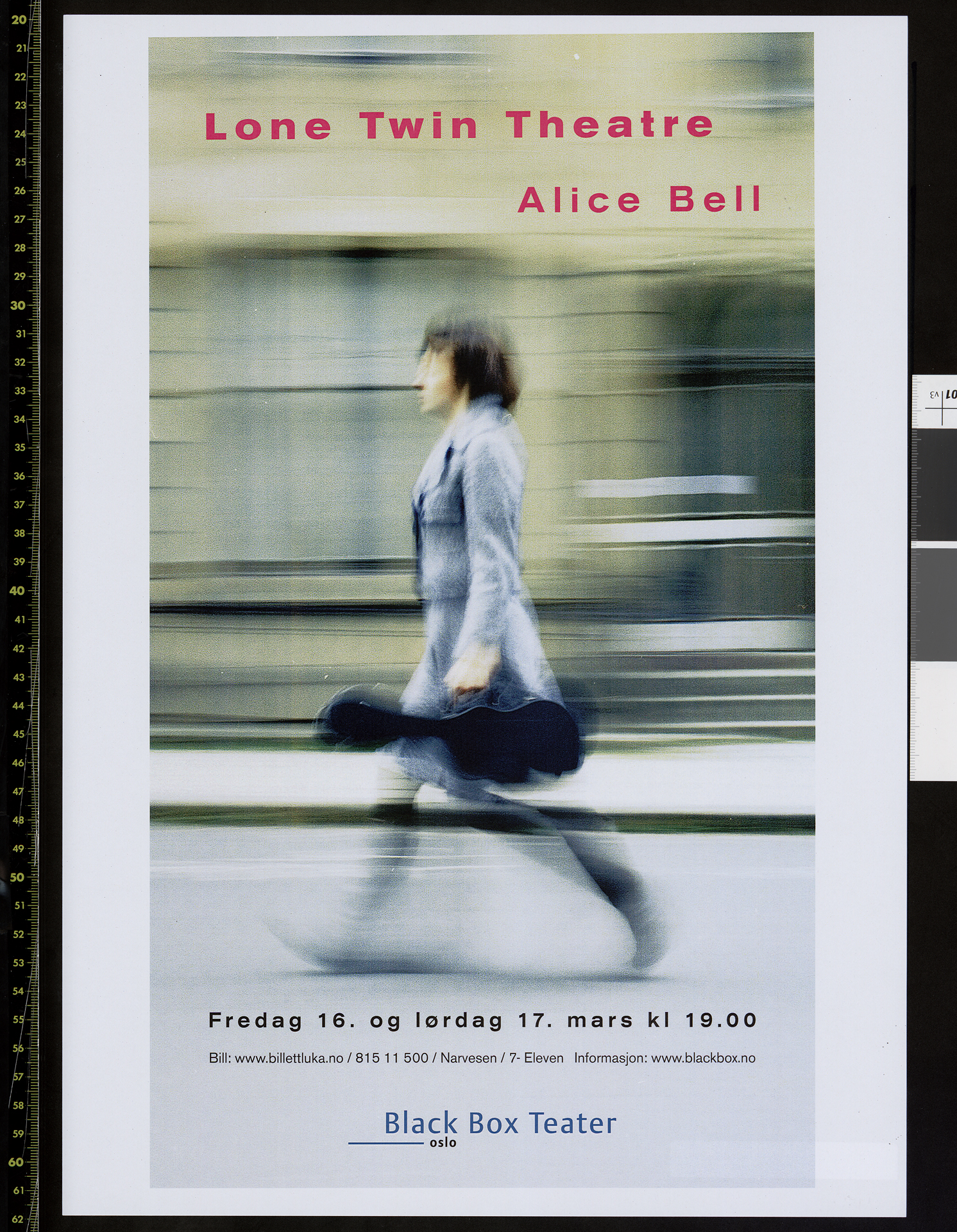 Poster for Lone Twin Theatre's production Alice Bell (2006). The poster is for the performances at Black Box Teater in Oslo in March 2007.