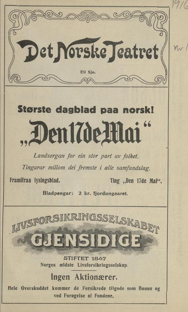 Program fra Det Norske Teatrets produksjon Eli Sjo (1916).