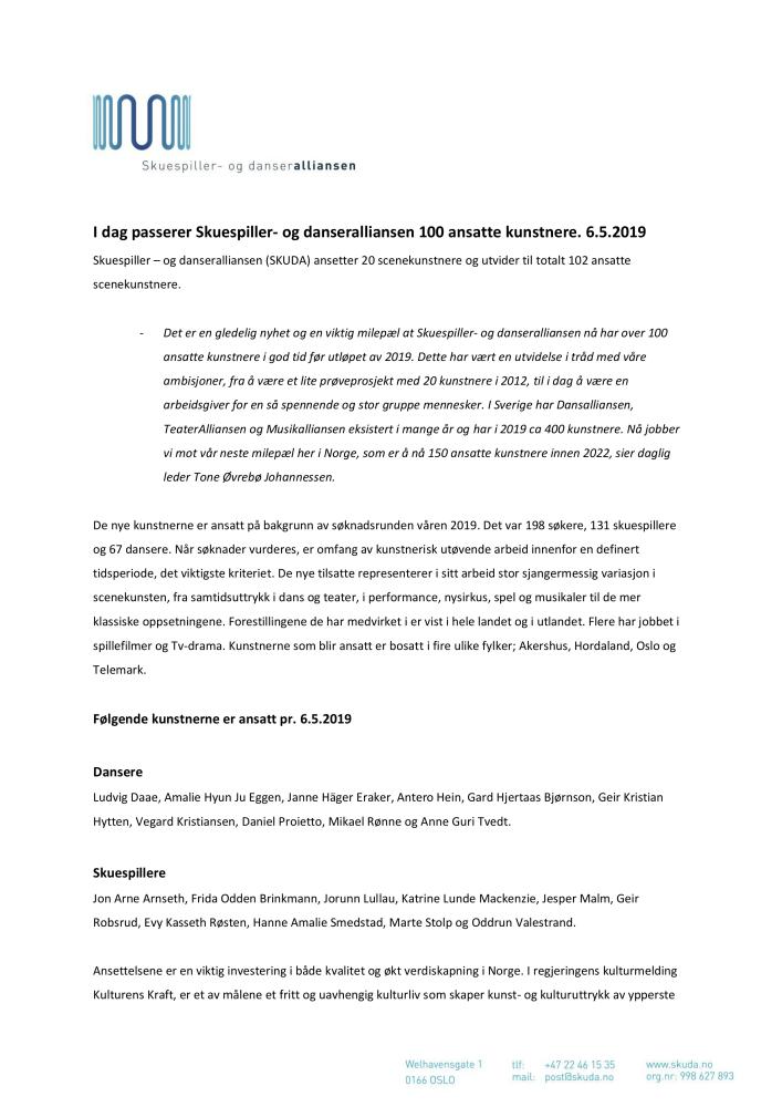 Pressemelding fra Skuespiller- og danseralliansen 7. mai 2019