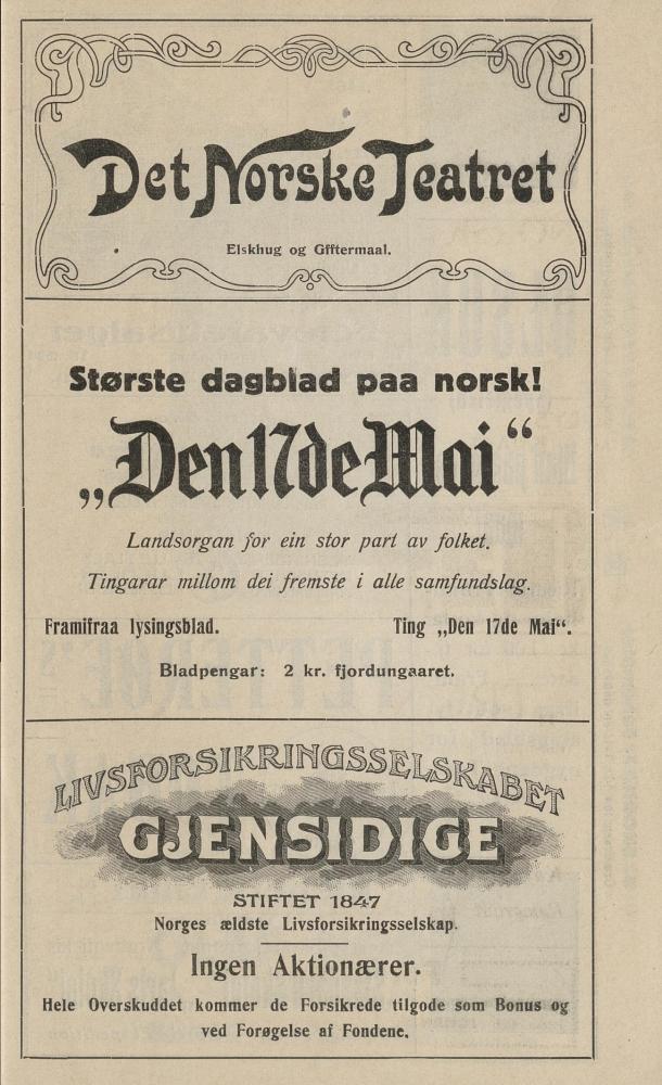 Forestillingsprogram for Det Norske Teatrets produksjon Elskhug og Giftarmaal (1917).