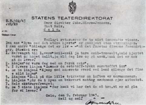 Eksempel på hvordan en tilbakemelding om sensur på revyviser hos Chat Noir fra Statens Teaterdirektorar kunne se ut.
