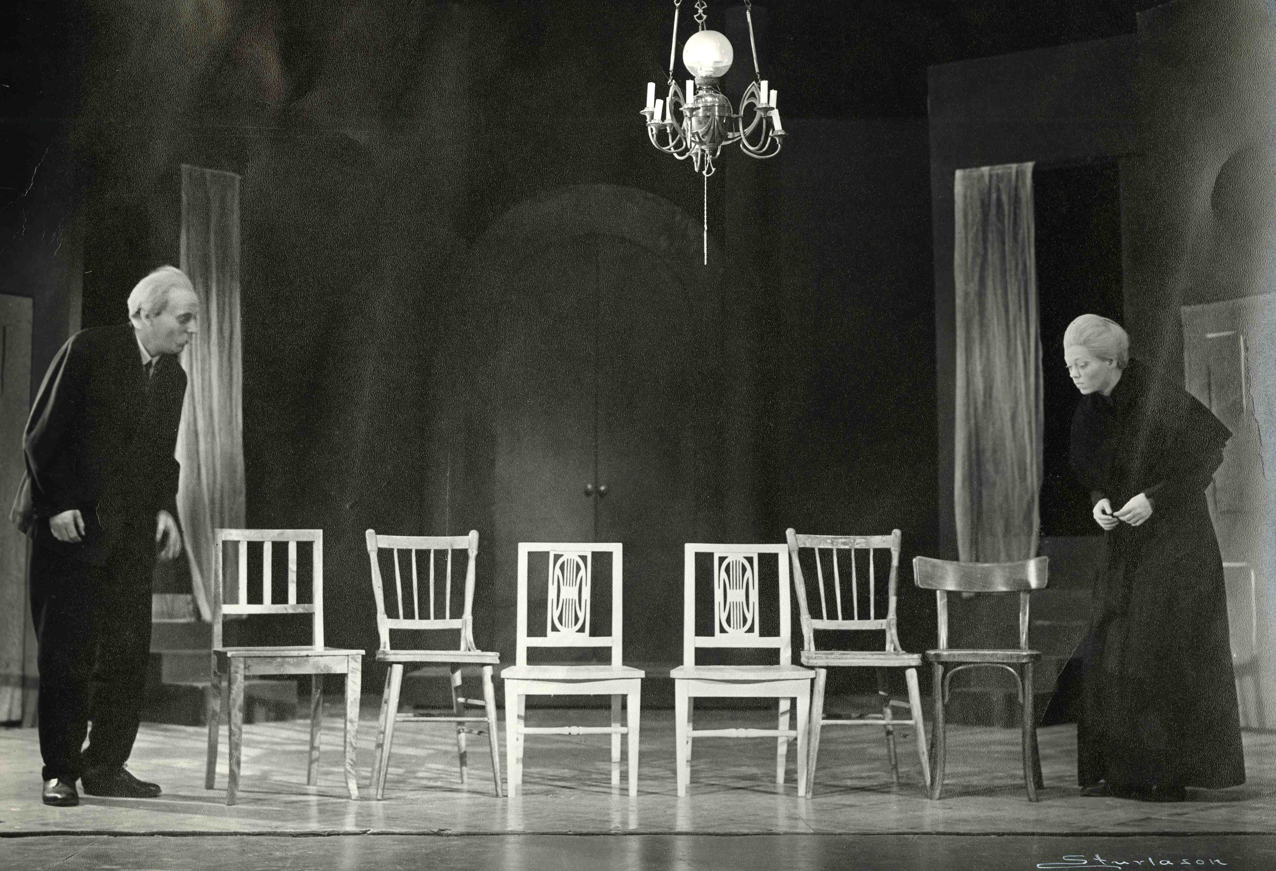 Fotografi fra Det Nye Teaters produksjon Stolene (1957)
