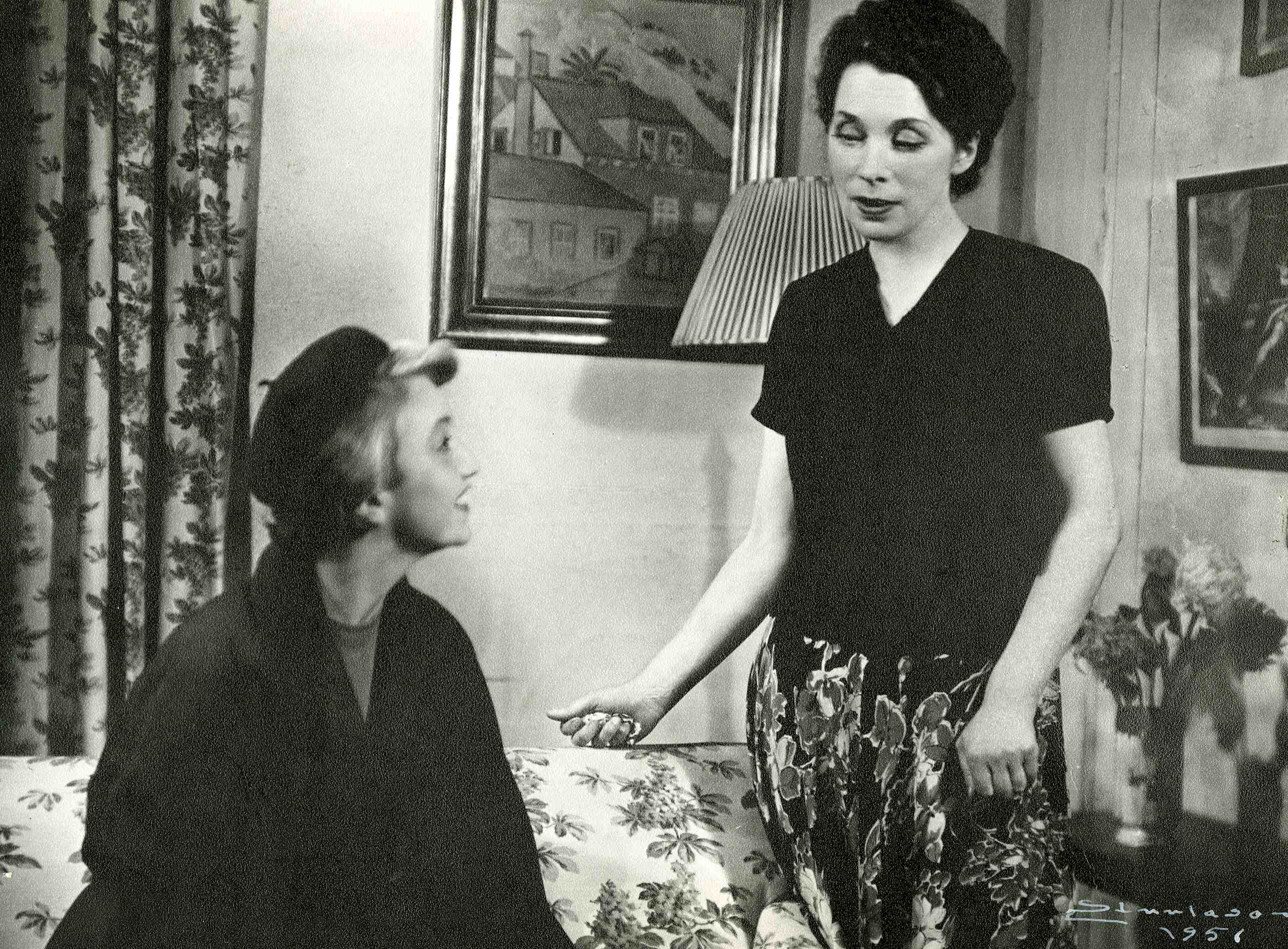 Fotografi fra Det Nye Teaters produksjon Hjemme klokken 7 (1951).