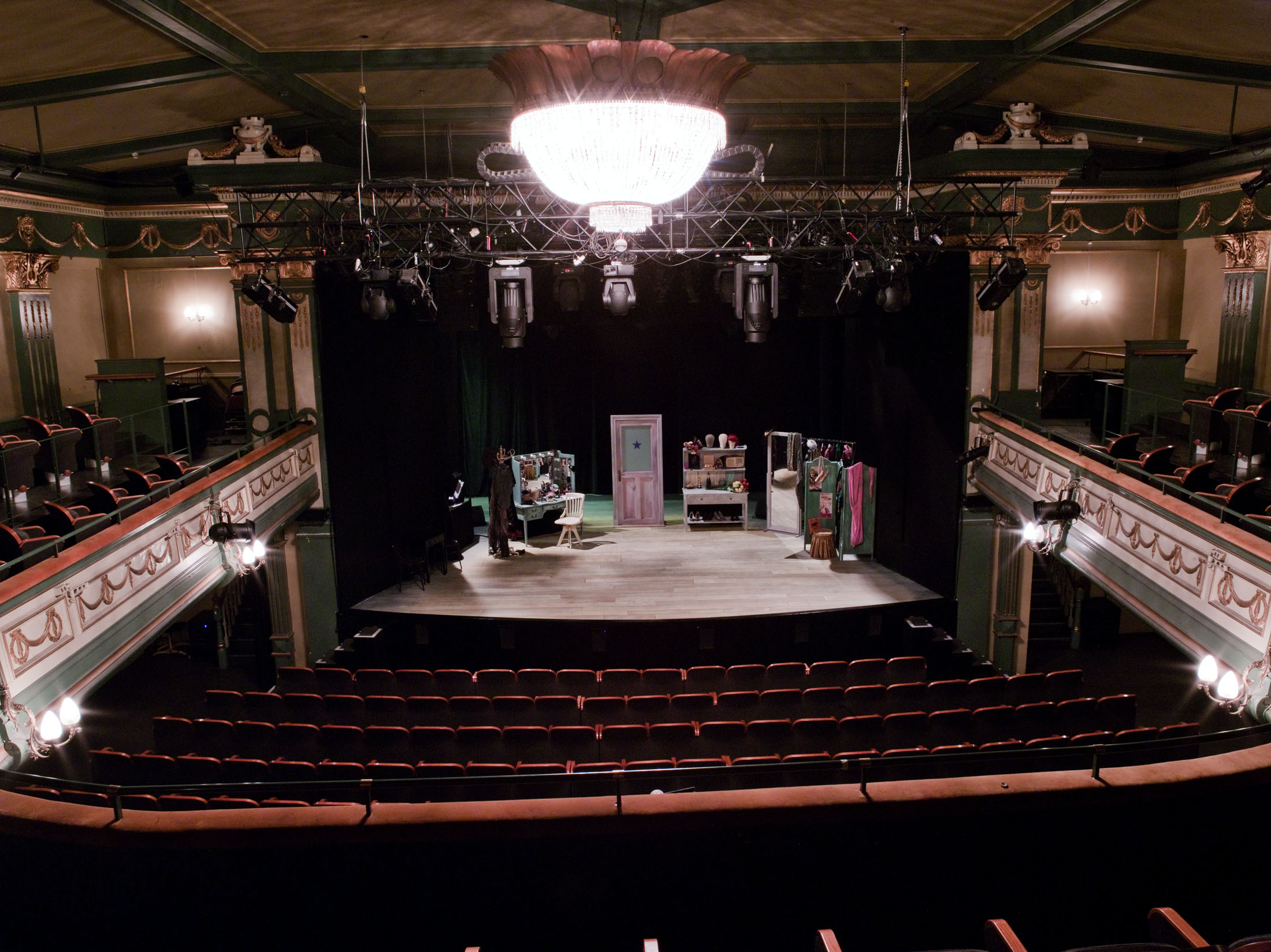 Fotografi av scenen, balkong og amfiet i Centralteatret.