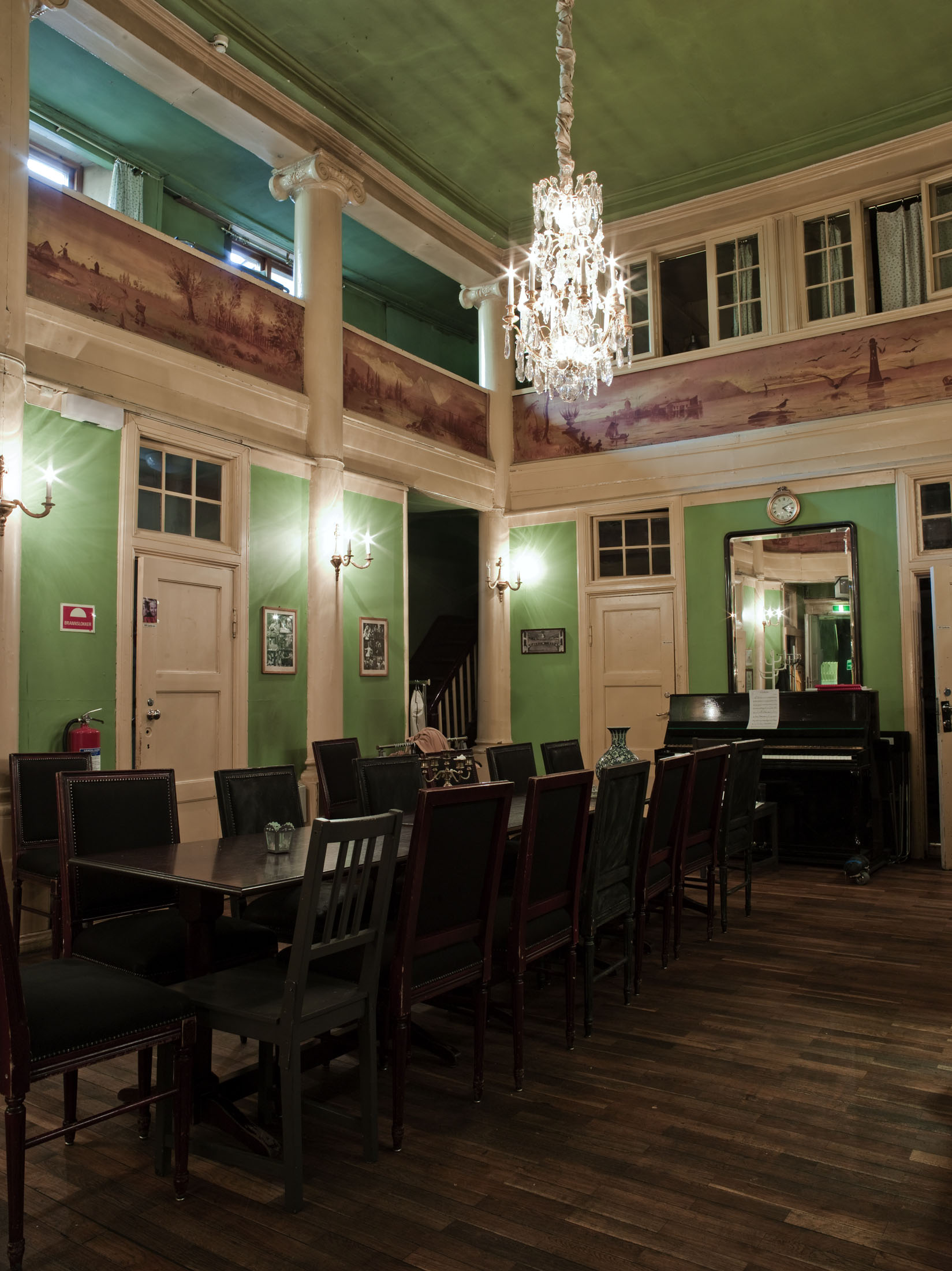 Fotografi av Søylesalen i Centralteatret. Søylesalen ble bygget i 1826 som ball- og festlokale for Christiania Dramatiske Selskab. Søylesalen er bevart og fungerer i dag som skuespillerfoajé og garderober på Oslo Nye Centralteatret