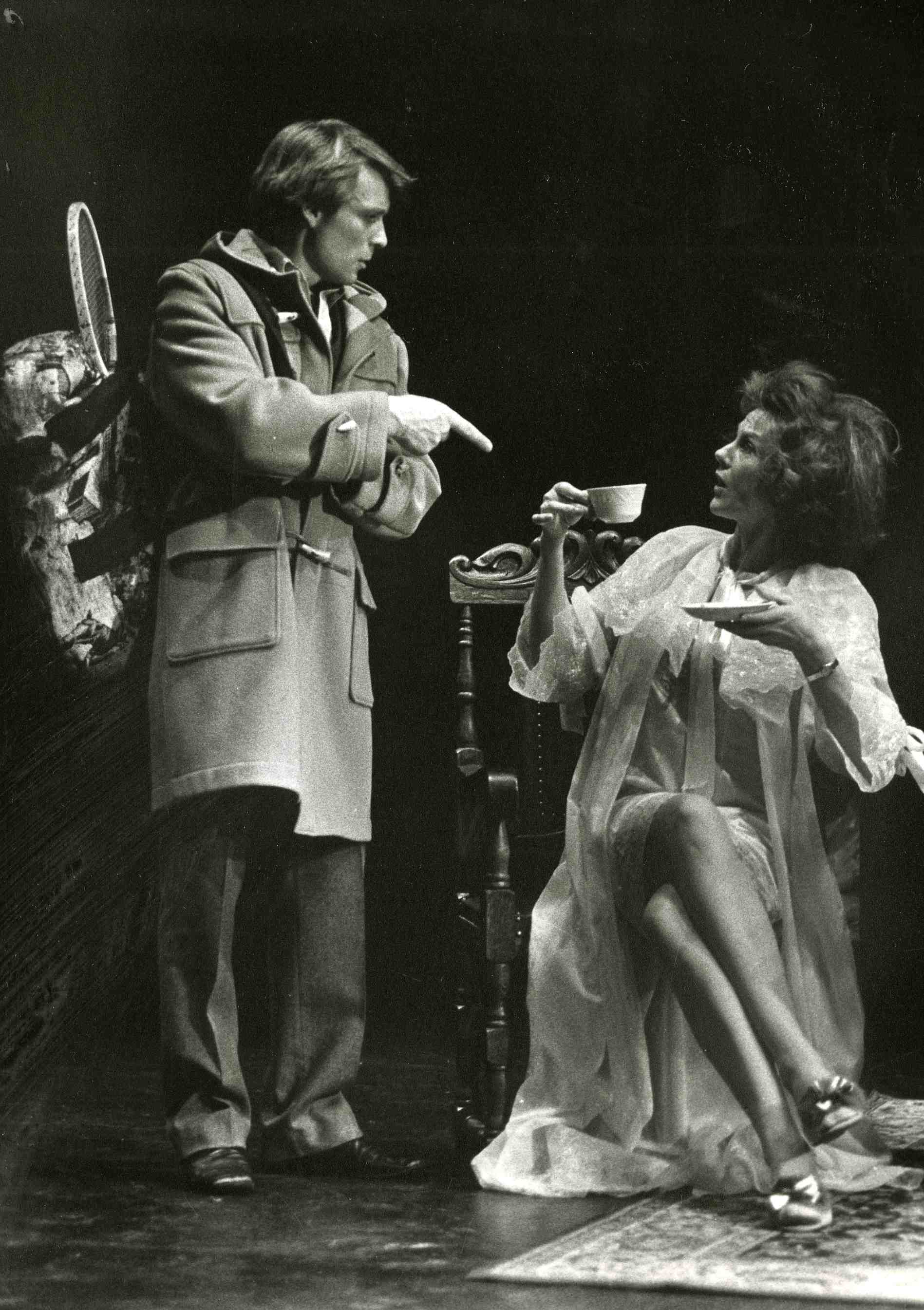 Fotografi fra Oslo Nye Teaters produksjon Spisestuen (bank i bordet) (1983).