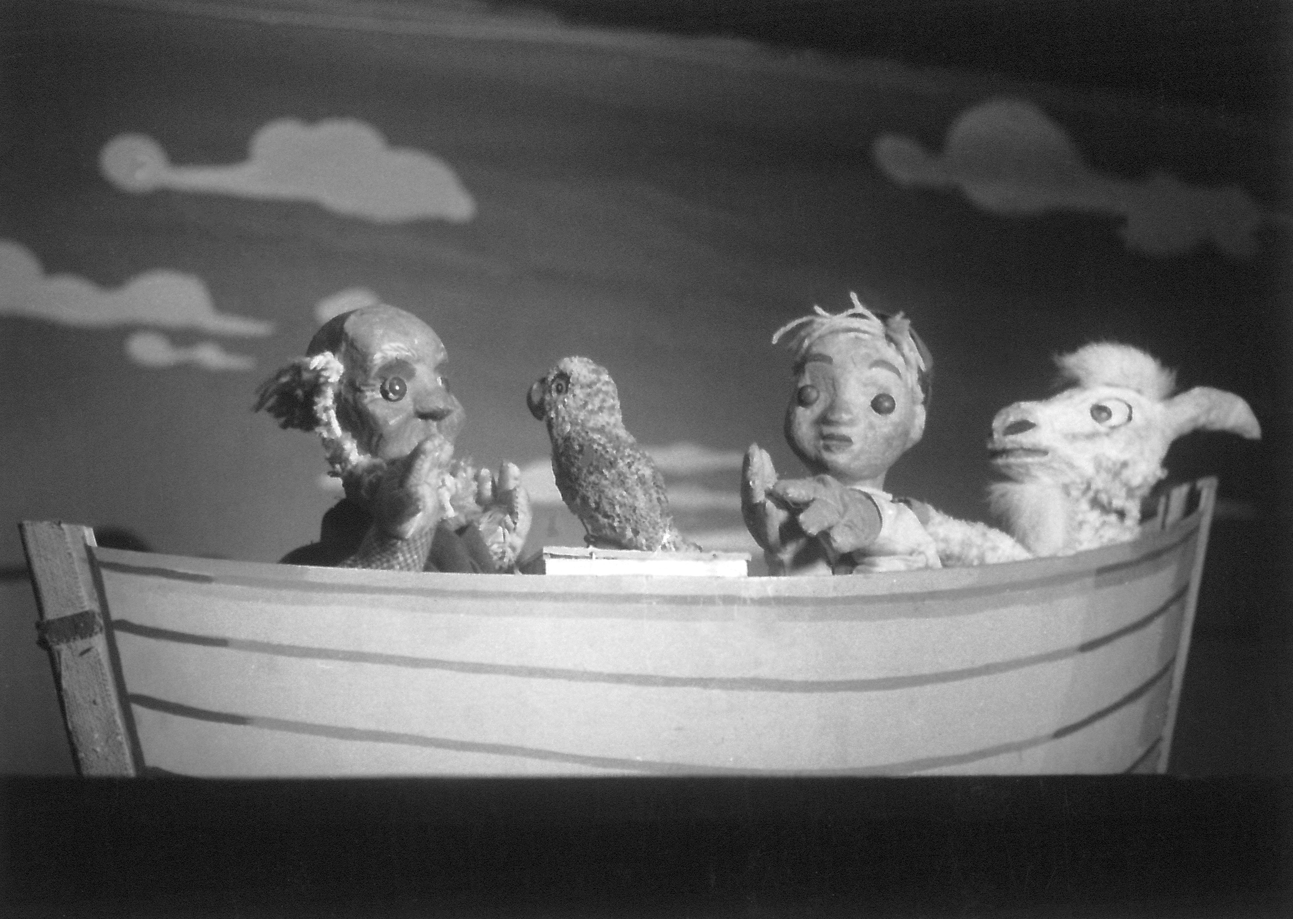 Fotografi fra Folketeatrets produksjon av Nils og Blåmann (1953).