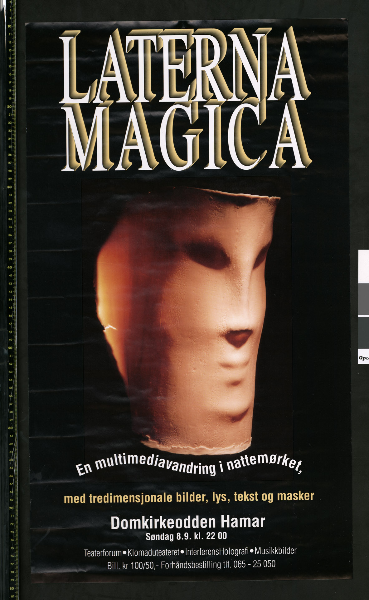 Plakat for samarbeidsprosjektet mellom Interferens Holografi, Teaterforum, Klomadu Teater og LOOC (Lillehammer Olympic Organising Committee) Laterna Magica I-III (1991)