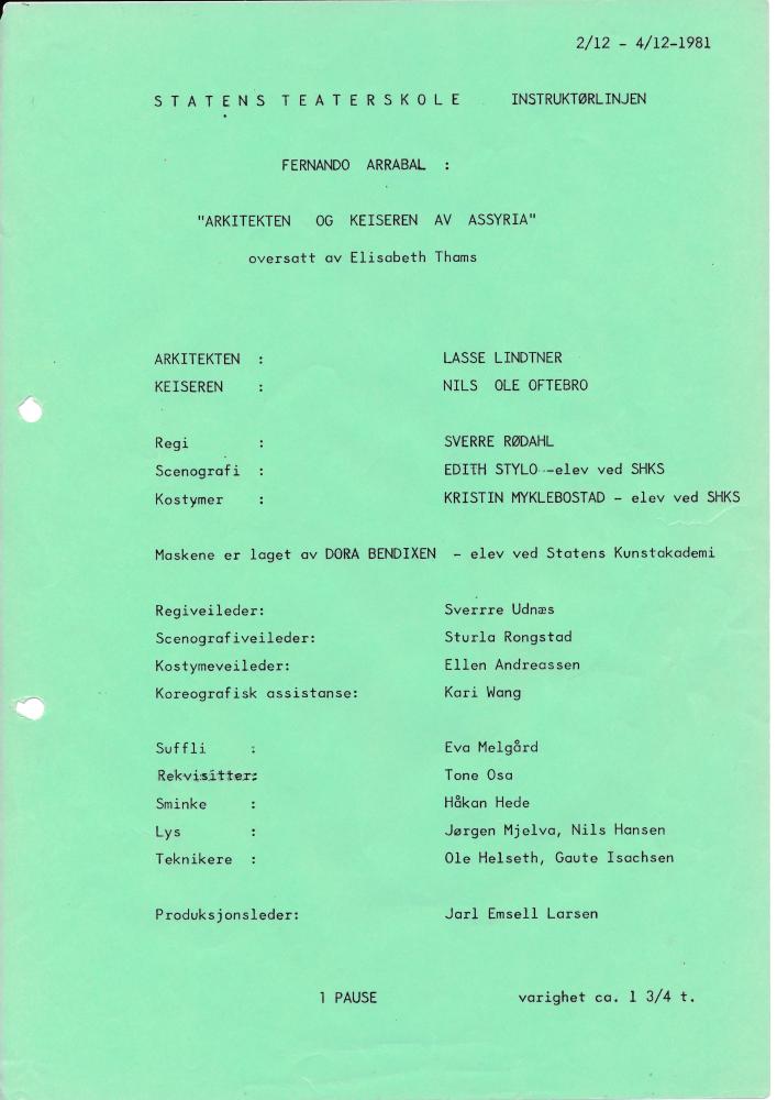 Program til Statens teaterskoles elevvisning Arkitekten og keiseren av Assyria, regi: Sverre Rødahl, 3.klasse instruktørutdanningen med profesjonelle skuespillere i rollene (1981)