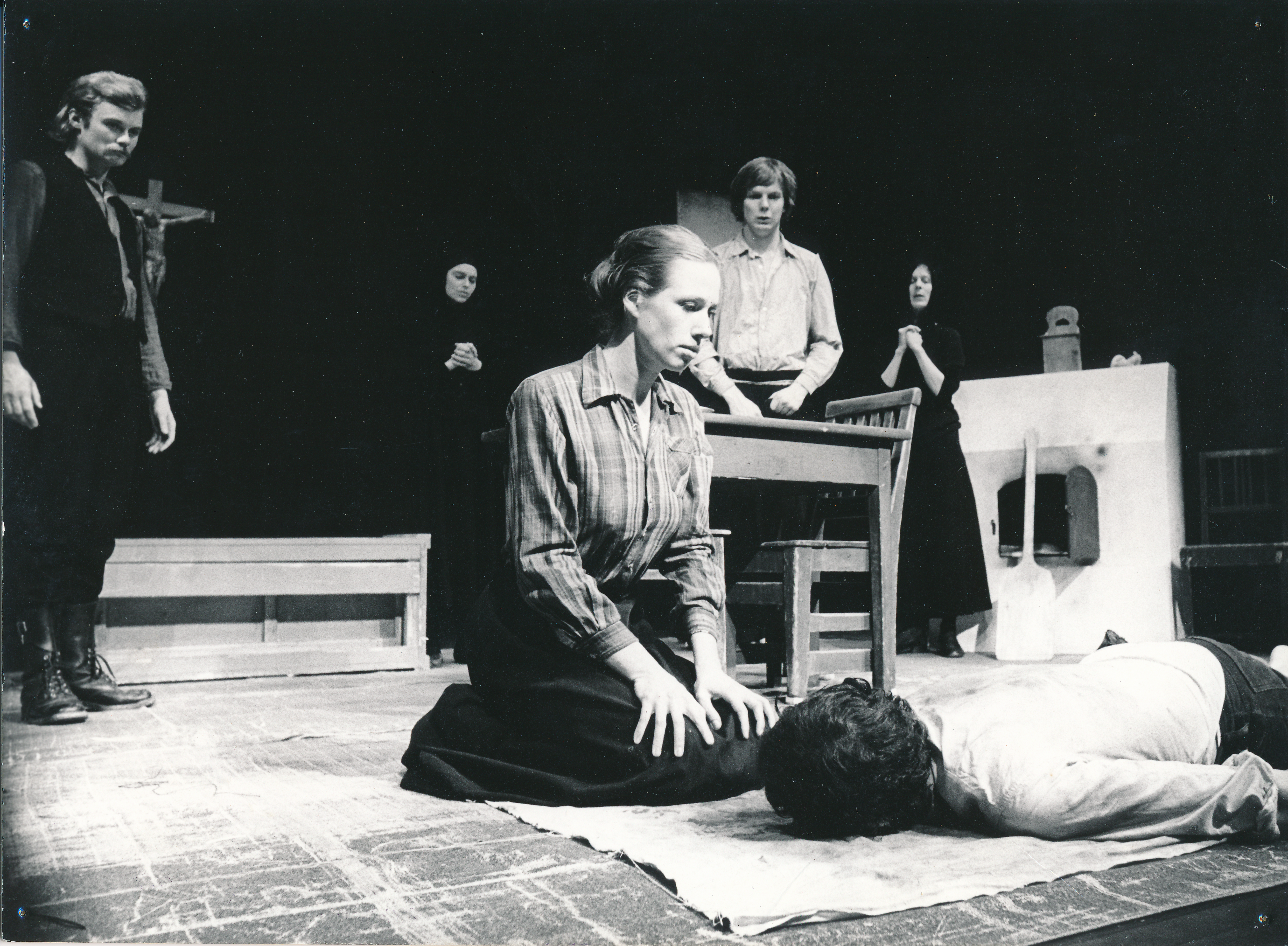 Fotografi fra Statens teaterskoles elevvisning Fru Carrars gevær (1975)
