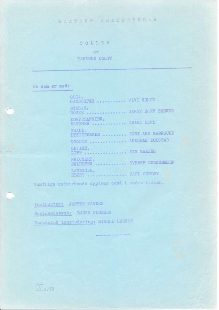 Program fra Statens teaterskoles elevvisning Toller (1975)