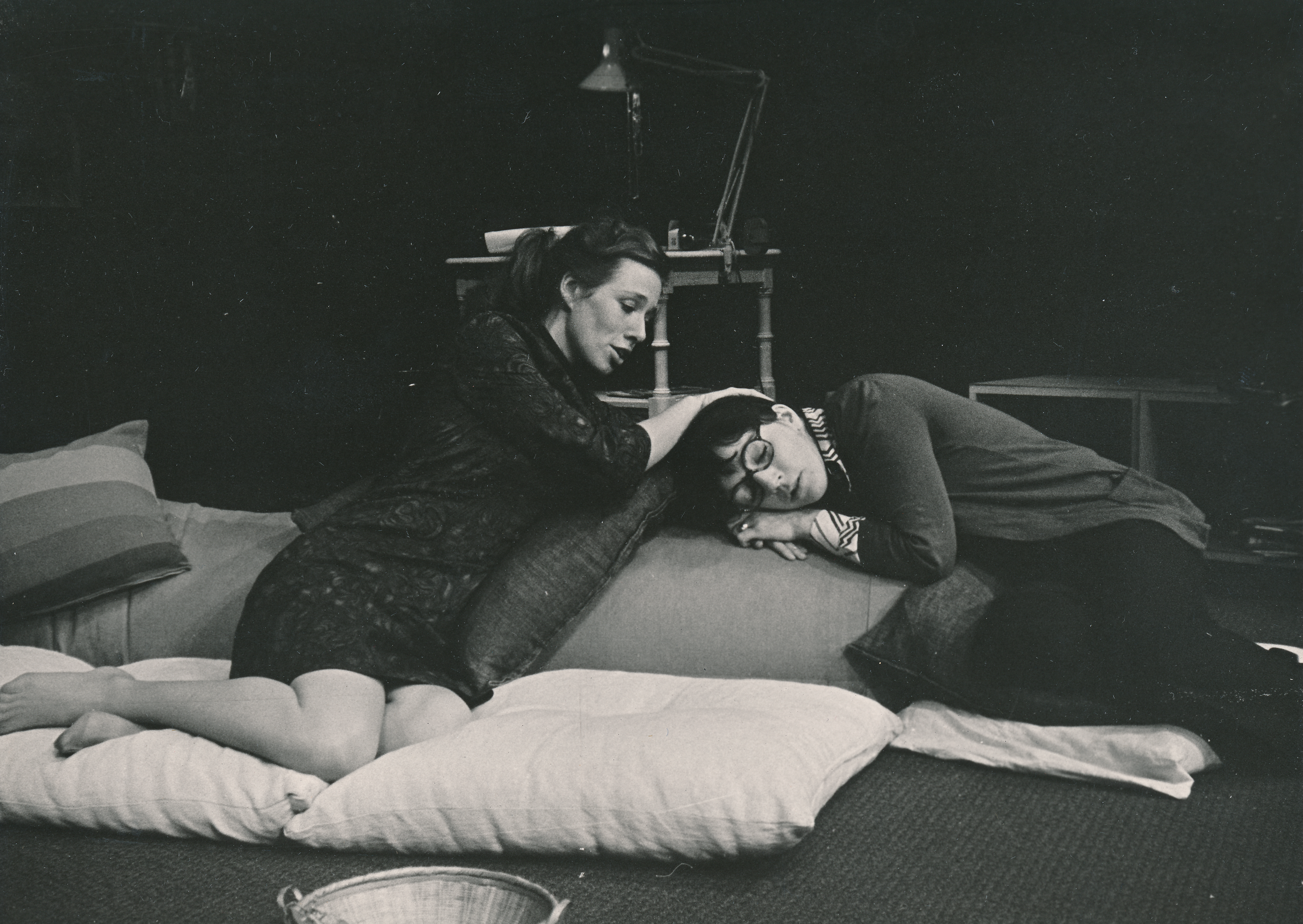 Fotografi fra Statens teaterskoles visning av To akter for fem kvinner (1974) med elever fra 3.klasse skuespillerutdanningen.