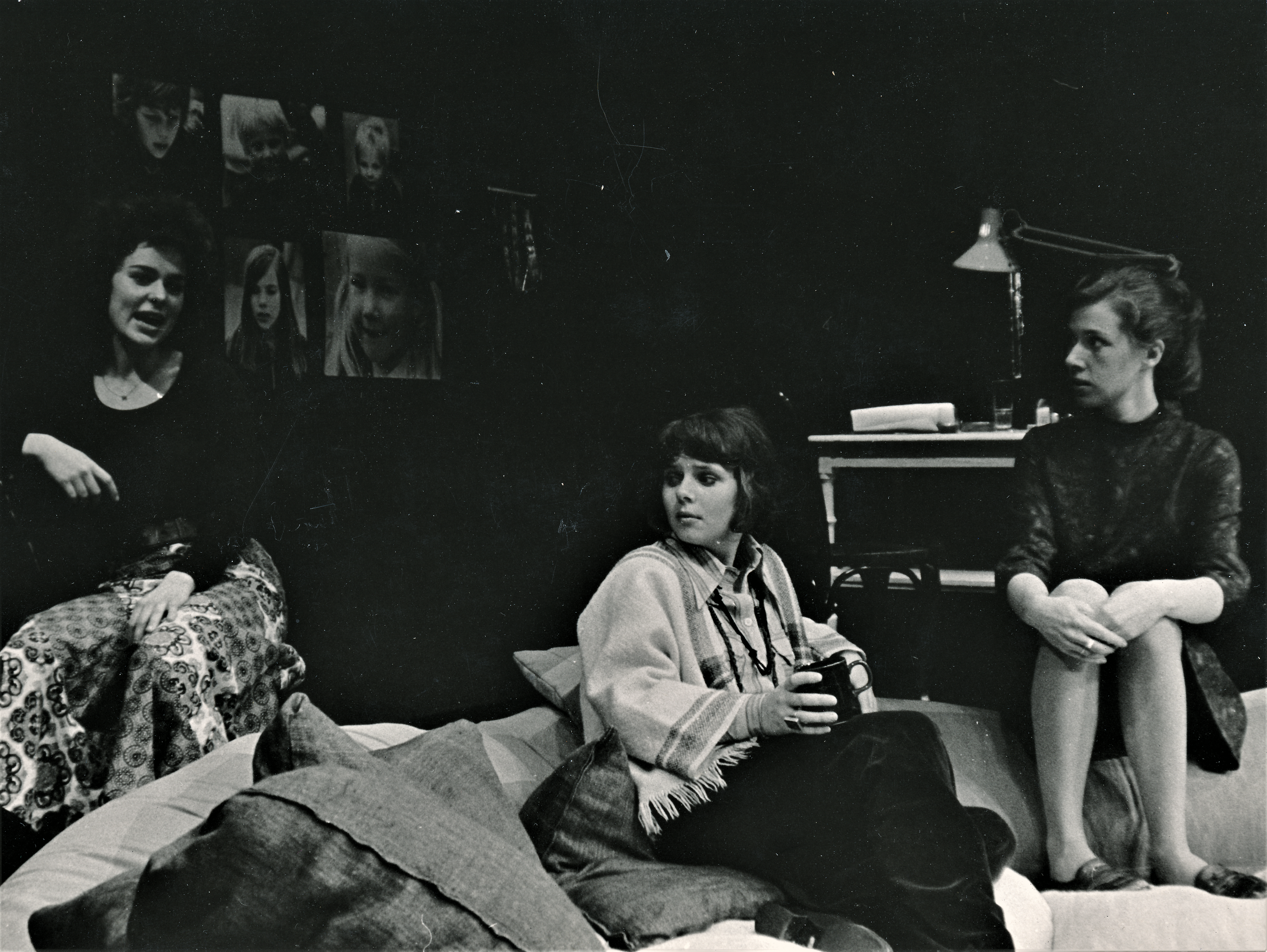 Fotografi fra Statens teaterskoles visning av To akter for fem kvinner (1974) med elever fra 3.klasse skuespillerutdanningen.