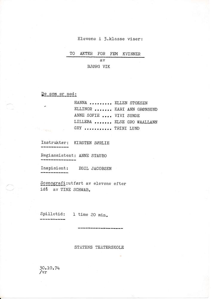 Program fra Statens teaterskoles elevvisning To akter for fem kvinner (1974)