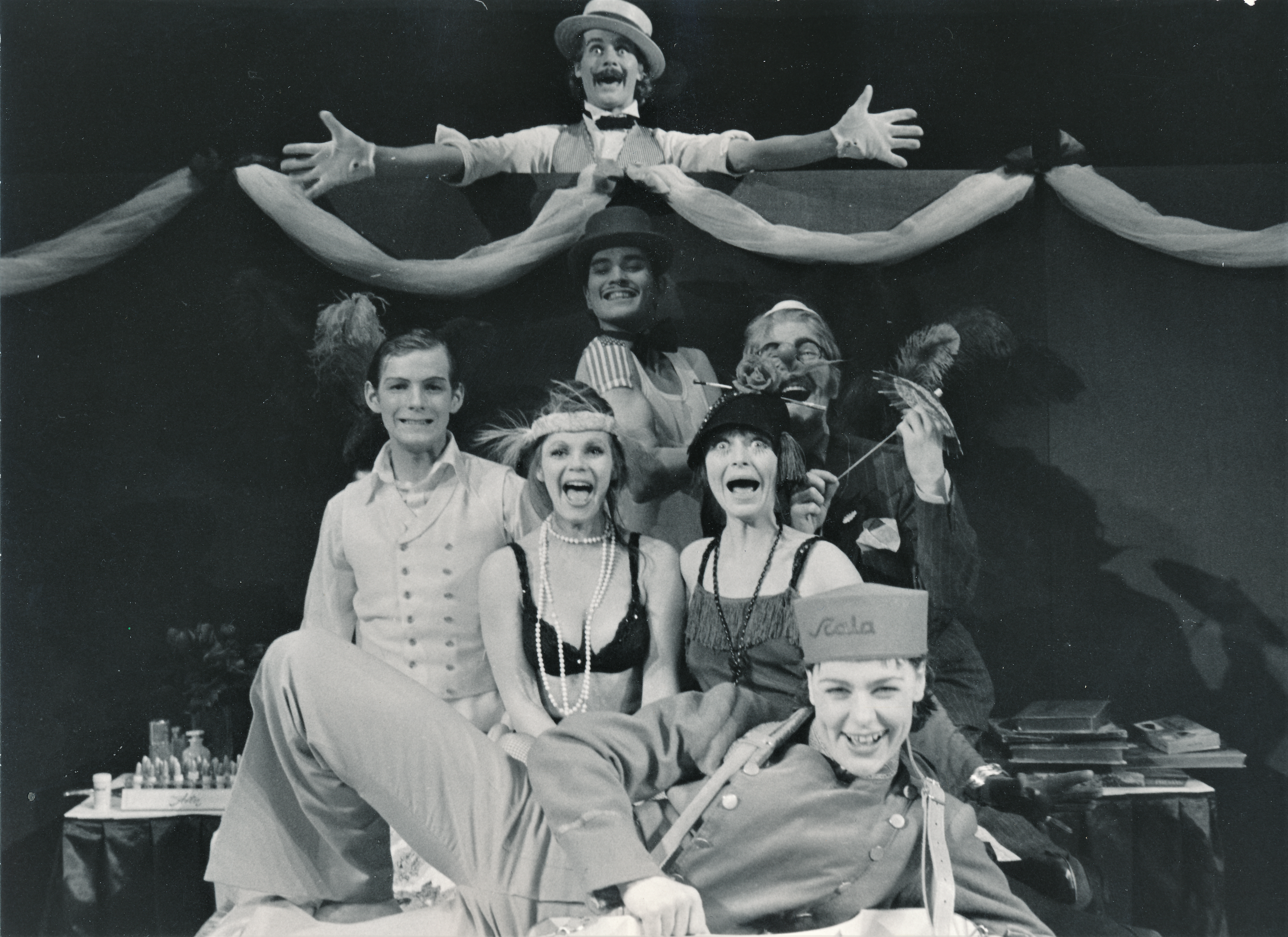 Fotografi fra Statens teaterskoles elevvisning Piken i bilen med 3.klasse skuespillerutdanningen (1975)