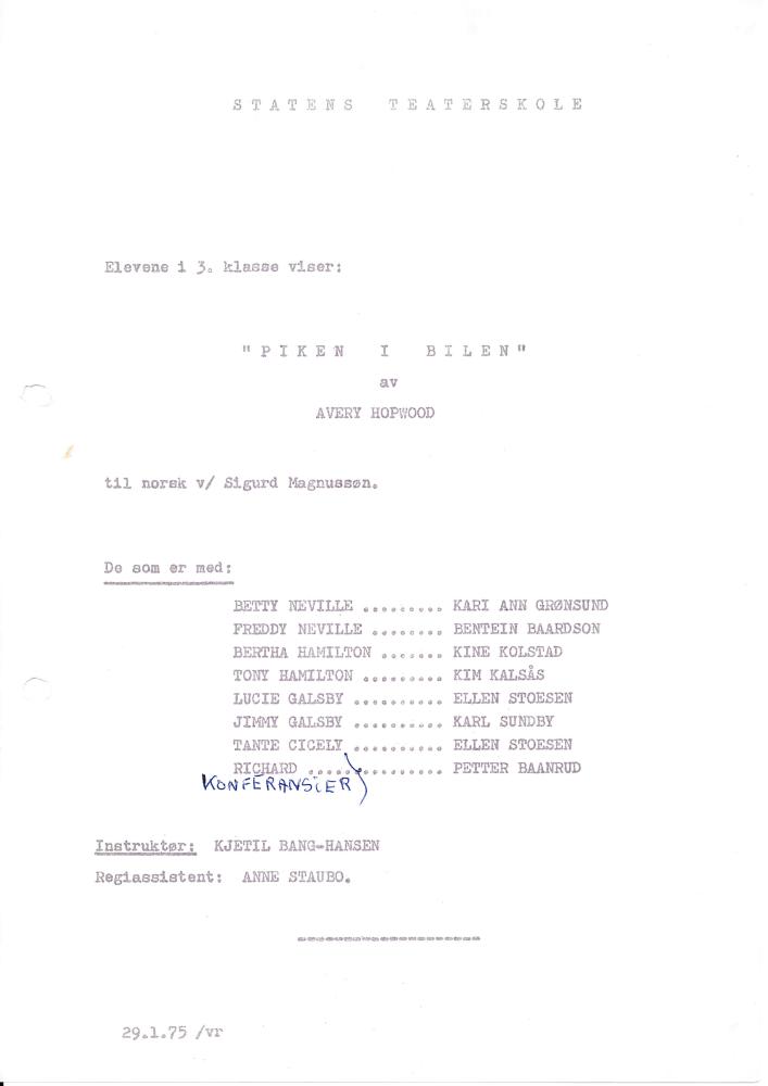 Program fra Statens teaterskoles elevvisning Piken i bilen med 3.klasse skuespillerutdanningen (1975)