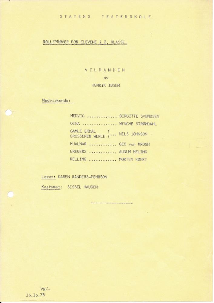 Program til Statens teaterskoles visning av Vildanden med 2.klasse skuespillerutdanningen (1978)