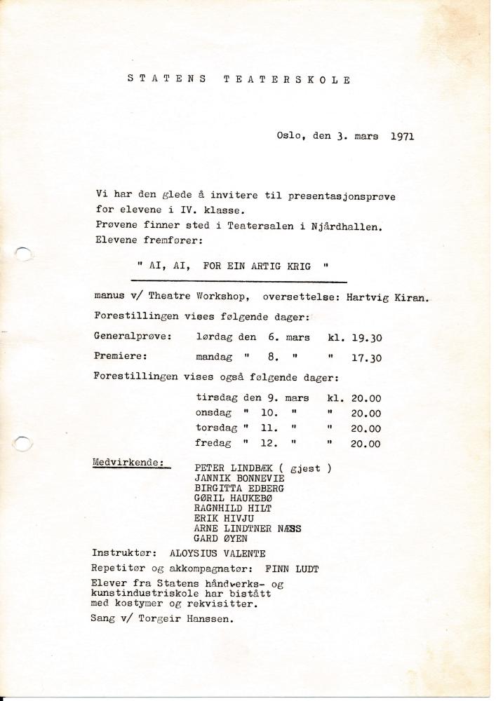 Invitasjon til Statens teaterskoles elevvisning Ai, ai, for ein artig krig med 4.klasse skuespillerutdanningen (1971).