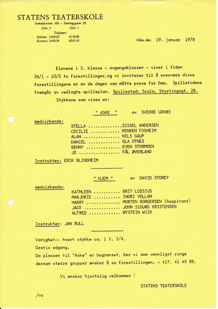 Program fra Statens teaterskoles elevvisning Hjem med 3.klasse skuespillerutdanningen (1978)