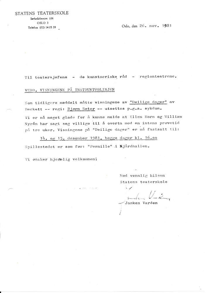 Invitasjon med rettelser til Statens teaterskoles produksjon Deilige dager (1981)