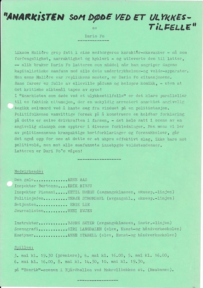 Invitasjon til Statens teaterskoles visning Anarkisten som døde ved et ulykkestilfelle (1982)