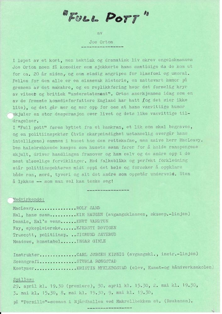 Invitasjon til Statens teaterskoles produksjon Full pott (1982)