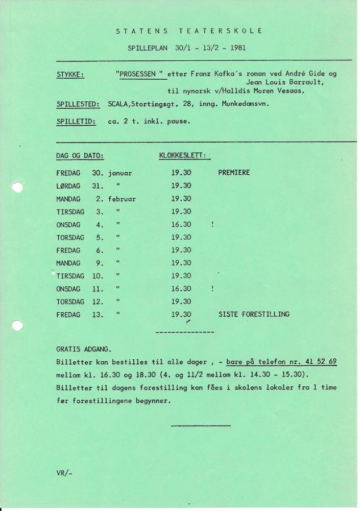 Invitasjon til Statens teaterskoles produksjon Prosessen (1981)