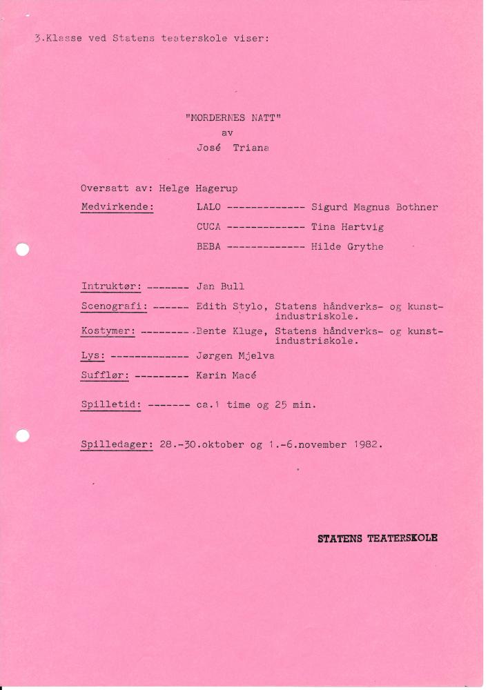 Program til Statens teaterskoles produksjon Mordernes natt (1982).