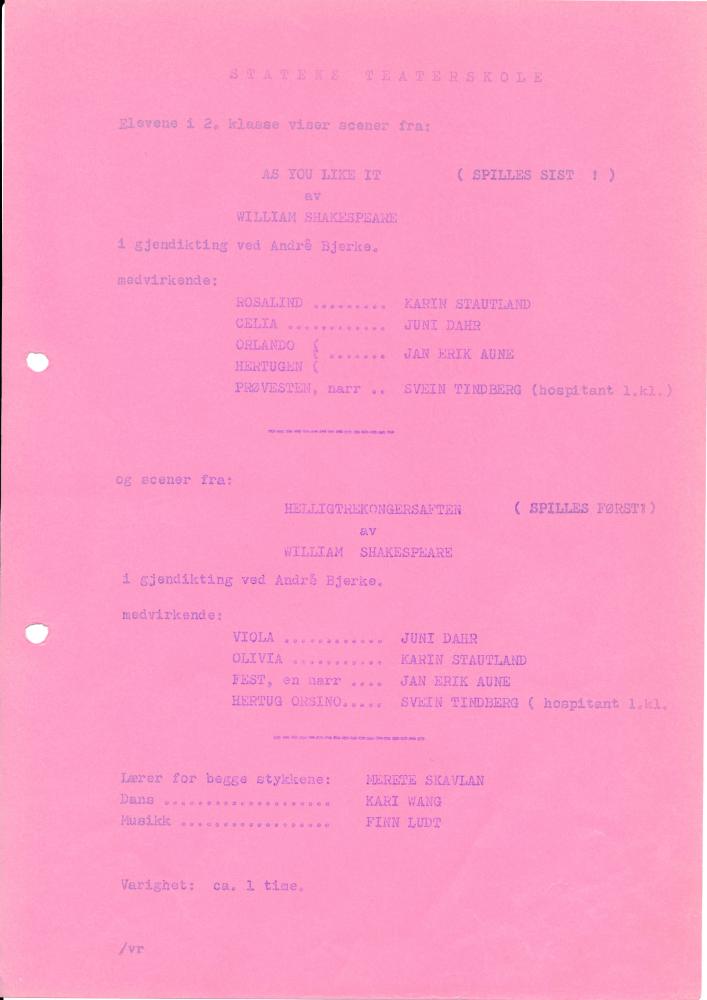 Program fra Statens teaterskoles visning av scener fra Helligtrekongersaften og As You Like It med 2.klasse skuespillerutdanningen (1975)