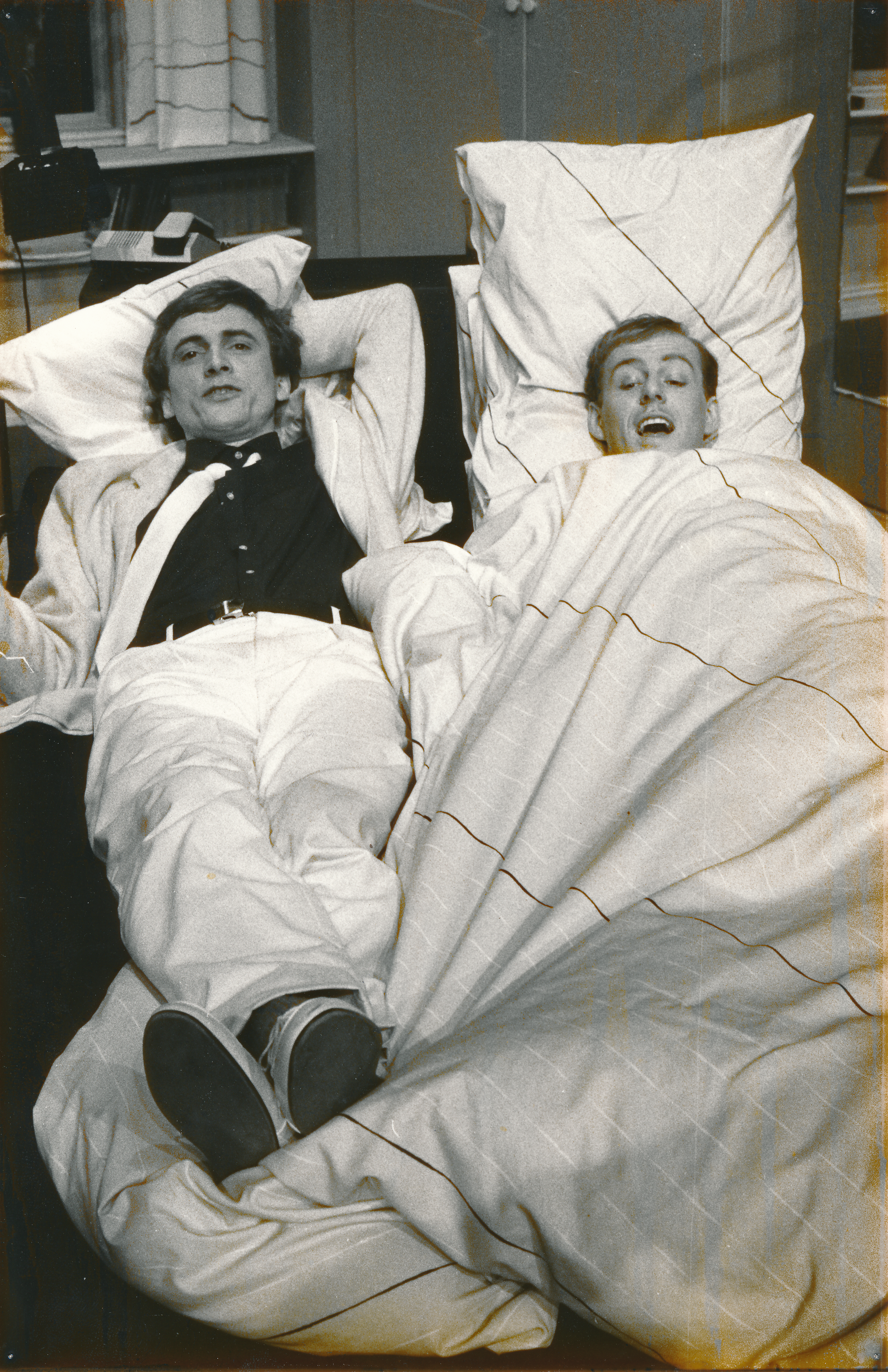 Fotografi fra Statens teaterskoles visning Sengelek med 3.klasse skuespillerlinjen (1983)