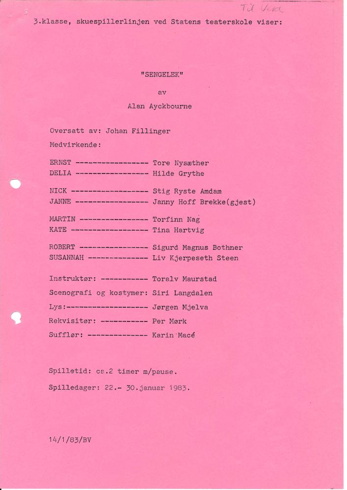 Program til Statens teaterskoles elevvisning Sengelek (1983)