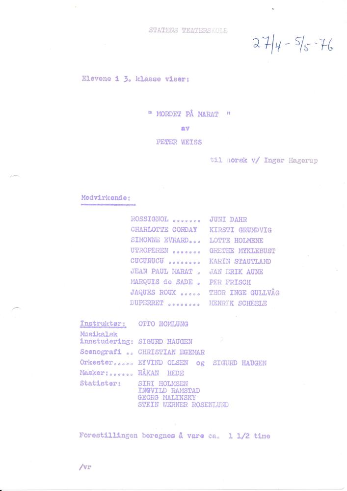 Program til Statens teaterskoles elevproduksjon Mordet på Marat med 3.klasse skuespillerutdanningen (1976).