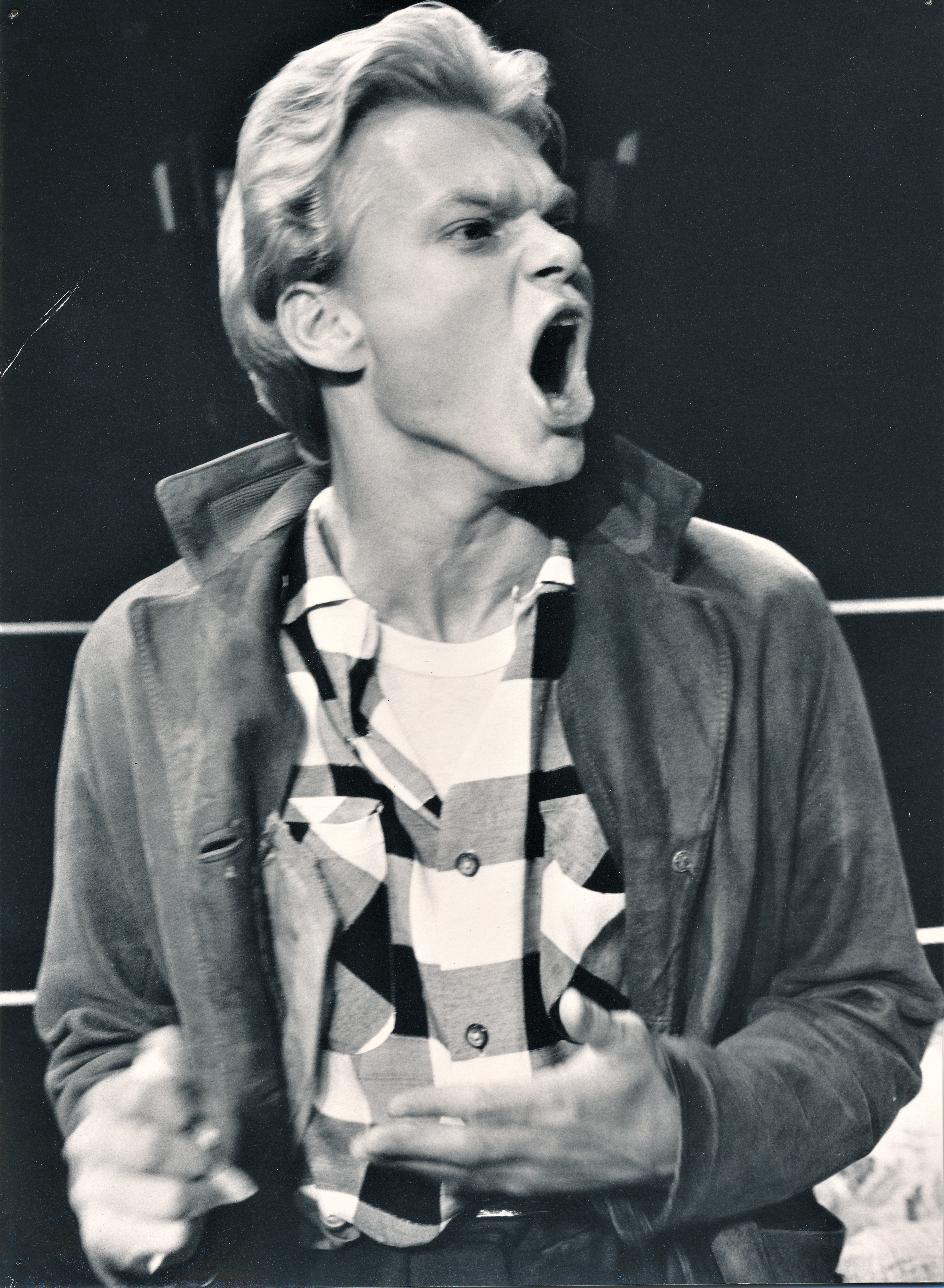 Fotografi fra Statens teaterskoles visning Se deg om i vrede med 3.klasse skuespillerlinjen (1983)
