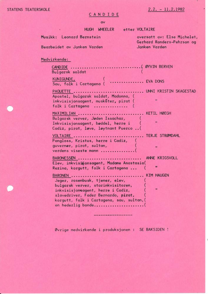 Program til Statens teaterskoles musikalproduksjon Candide med 3.klasse skuespillerlinjen, side 1 (1982).