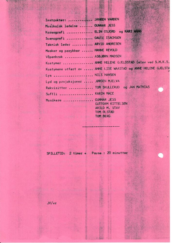 Program til Statens teaterskoles musikalproduksjon Candide med 3.klasse skuespillerlinjen, side 2 (1982).