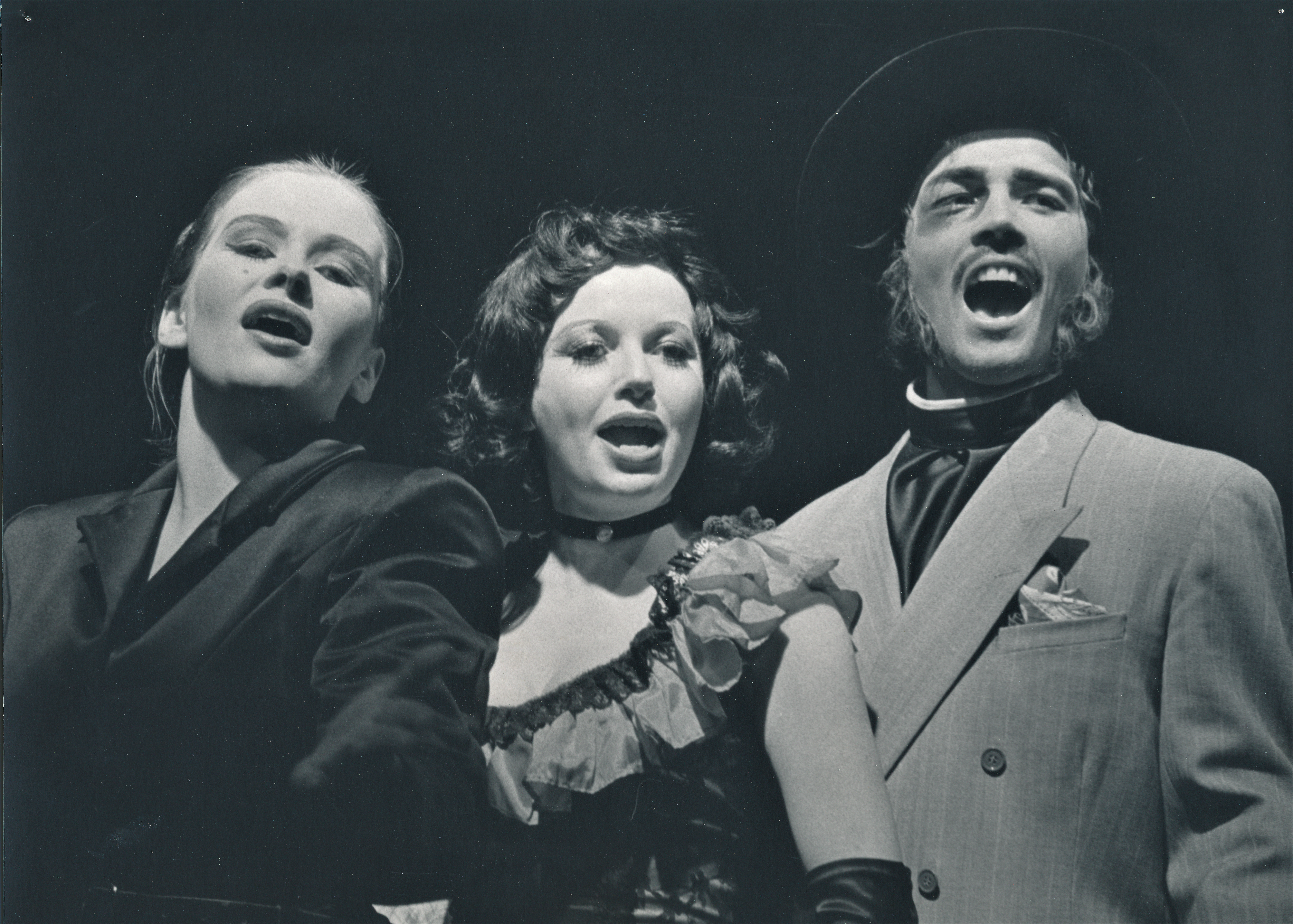 Fotografi fra Statens teaterskoles musikalproduksjon Mahagonny med 3.klasse skuespillerlinjen (1984).