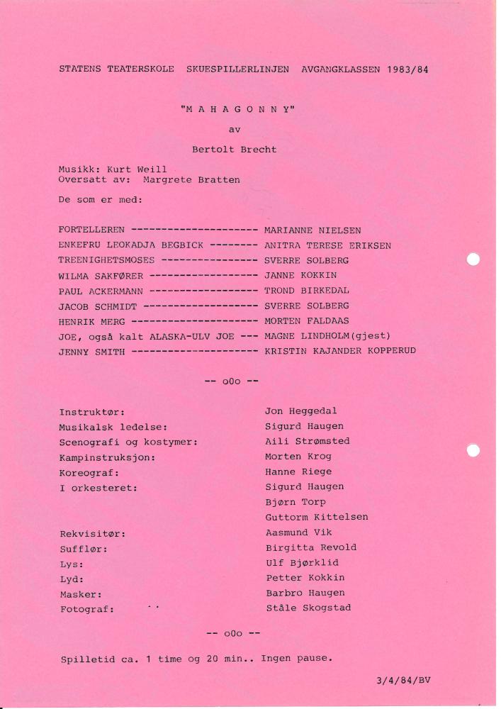 Program til Statens teaterskoles visning Mahagonny med 3.klasse skuespillerlinjen(1984)