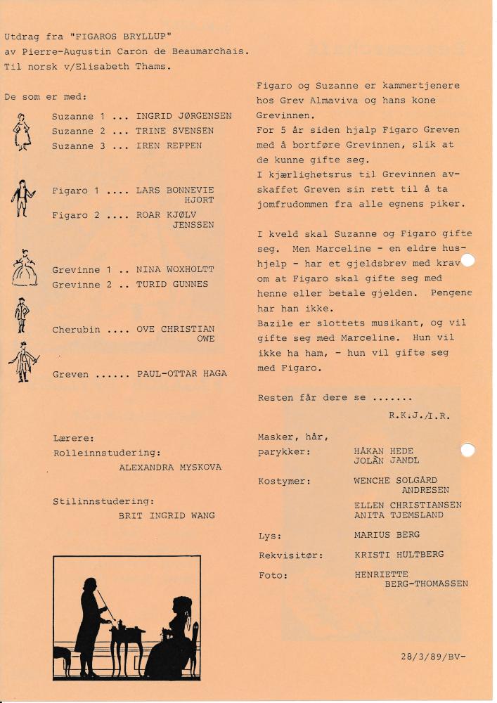 Program til Statens teaterhøgskoles visning av utdrag fra Figaros bryllup med 2.klasse skuespillerlinjen (1989).